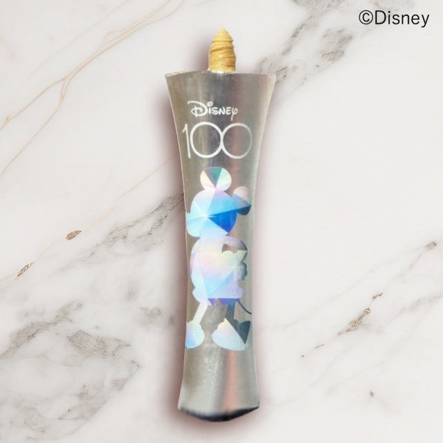 銀の100匁のろうそくにミッキーマウスを繊細な筆致で描いています。