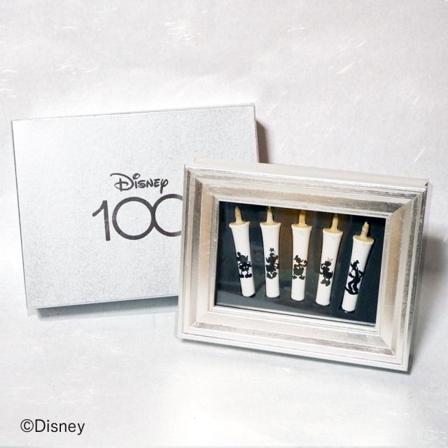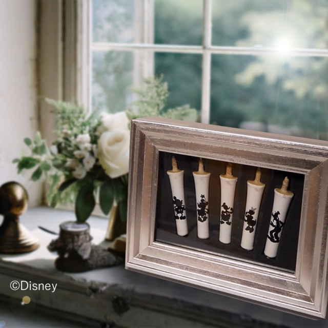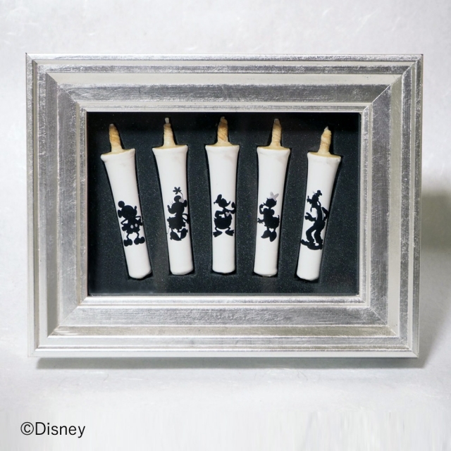 真っ白な和ろうそくにミッキーと仲間たちをシルエットアートで表現。キャラクター毎に銀のワンポイントが入っています。絵師が一本一本手描きした繊細な手わざを堪能ください。銀の額にいれました。