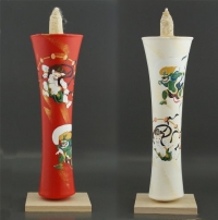 100匁の大きなろうそくに京絵師が風神雷神図を手描きしました。1本いり。朱と白の2種類があります。ギフトに最適。北山杉の燭台付。¥93,500(税込)