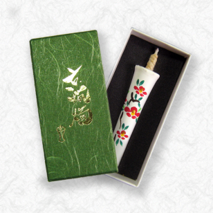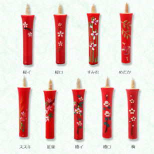 碇型の和蝋燭に、花の絵や金魚、メダカなどを描いています。